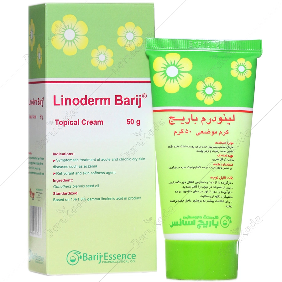 مطالعات فارماکولوژیک و مکانیسم اثر: ترکیبات موجود در روغن بذر گل مغربی به خصوص گاما لینولئیک اسید در بدن توسط آنزیم دلتا ـ 6 ـ دیساچوراز ابتدا به دیهموگالینولنیک اسید و سپس به پروستاگلاندین E1 تبدیل میگردد. این پروستاگلاندین دارای خاصیت ضد التهابی و تثبیت کننده غشاء سلولی میباشد. بر اساس نتایج تحقیقات انجام شده و مشاهدات تجربی، روغن بذر گل مغربی ضد التهاب، ضد حساسیت، تصحیح کننده کمبود اسید چرب ضروری omega-6 و کاهنده فشار خون است. تحقیقات بالینی: الف: در یک کارآزمایی باز، 20 بیمار مبتلا به پوست خشک و حالت (disposition) آتوپیک (نه درماتیت آتوپیک واقعی) کرم EPO (12.5%) را برای مدت 3 هفته به قسمت پایین پای راست خود مالیدند. پای دیگر به عنوان کنترل در نظر گرفته شد. در پای درمان شده افزایش قابل توجه محتوی سبوم بدون هیچگونه تغییری در اتلاف آب از طریق اپیدرم مشاهده شد. در پای درمان نشده؛ اتلاف آب از طریق اپیدرم قابل توجه بود . علاوه بر این افزایش نرمی پوست در پای درمان شده دیده شد. ب: در یک کارآزمایی بدون کنترل، شیرخواران مبتلا به درماتیت آتوپیک برای مدت 28 روز تحت درمان با (GLA (3 g/da قرار گرفتند. بهبود تدریجی در اریتم، خراش های پوستی (excoriations) و چرمی شدن پوست (lichenification) مشاهده شد. اختلاف معنی داری از نظر خارش و استفاده از آنتی هیستامین ها نشان داده شد. همچنین افزایش شایان توجه درصد سلول های CD8 در حال گردش دیده شد. ج: در 2 بررسی، GLA نیاز به استروئیدهای موضعی (حدود70درصد) و سایر داروها نظیر استروئیدهای خوراکی، آنتی هیستامینها و آنتی بیوتیکها را کاهش داده است. همچنین دو مطالعه مستقل با روش اجرای متفاوت نشان داده اند که EPO می تواند زبری (roughness) پوست را نیز بطور قابل توجهی کاهش دهد. علاوه بر این، یک مطالعه دوسو بیخبر کنترل شده با پلاسبو در بچه های مبتلا به درماتیت آتوپیک، بهبودی قابل توجه در شدت کلی درماتیت در بچه های درمان شده با GLA را مستقل از بروز آلرژی با واسطه IgE نشان داد و درمان با GLA مقدار اسیدهای چرب omega-6 را در غشای گلبول های قرمز خون به ویژه در کسانیکه با دوزهای بالاتر درمان شده بودند، افزایش داده بود. با مرور کارآزمایی های بالینی انجام شده برای درمان اگزمای آتوپیک با EPO که در سال1992 منتشر گردید، مشخص شد که کارآزمایی های موازی کنترل شده با پلاسبو بهبودی برجسته ناشی از EPO را نشان میدهند. در مقایسه با گروه کنترل، بیماران درمان شده با EPO التهاب، خشکی، پوسته ریزی و شدت کلی کمتری را نشان دادند. کرم موضعی لینودرم با توجه به مطالب فوق؛ کرم لینودرم با بهره گیری از اثرات مفید روغن گل مغربی برای درمان علامتی بیماری های حاد و مزمن پوست خشک (Dry skin) مانند اگزما و به عنوان کمک درمان پسوریازیس و در مصارف عمومی برای تامین مجدد رطوبت و نرمی پوست توسط شرکت داروسازی باریج اسانس فرموله و تولید شده است. به منظور استفاده صحیح از این فراورده؛ توجه به نکات زیر توصیه می شود: کرم لینودرم طبق نظر پزشک یا روزانه 2 تا 3 بار در محل مربوطه بصورت یکنواخت مالیده شود. میتوان آنرا را با دوز توصیه شده در بالغین برای درمان علامتی بیماری های پوست خشک در همه سنین از جمله کودکان، بزرگسالان و سالمندان استفاده نمود. در صورت وجودحساسیت شناخته شده نسبت به روغن بذر گل مغربی و یا دیگر ترکیبات تشکیل دهنده دارو، استفاده از این کرم مجاز نیست. همچنین در زمان بارداری و یا شیردهی باید پس از مشورت با پزشک معالج و بنا به توصیههای ایشان از این کرم استفاده نمود. بهتر است در زمان شیردهی این کرم در محدوده سینه مالیده نشود و از وارد شدن کرم به دهان شیرخوار جلوگیری گردد. EPO بسیار خوب تحمّل می شود و هنگامی کـه با دوزهای درمانی در دوره های کوتـاه و میان مدت در کارآزماییهای بالینی به کار رفته، اثرات جانبی بسیار کمی گـزارش شده است. با اینحال همانند سایر داروها، ممکن است عوارض جانبی با مصرف مقادیر زیاد از کرم و یا مصرف طولانیمدت آن بروز کند. ندرتاً کرم لینودرم باعث سوزش و تحریک خفیف وگذرای ن