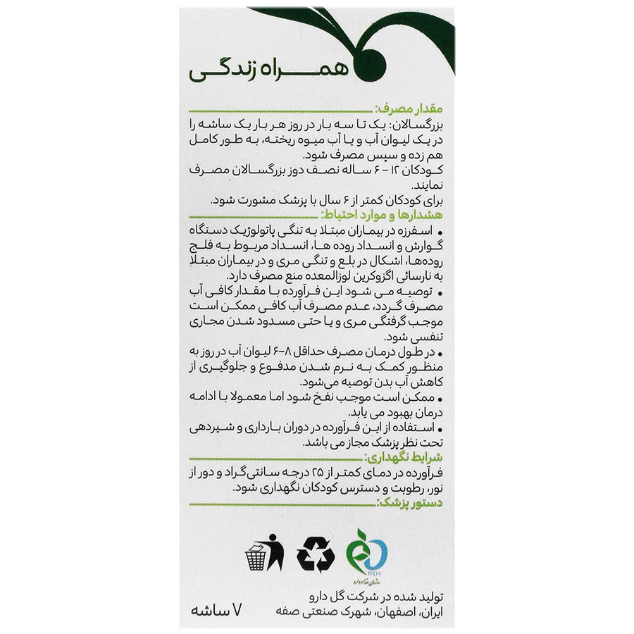 هر ساشه 10 گرمی حاوی 6.5 گرم پوست دانه اسفرزه استاندارد شده بر حسب 15% موسیلاژ