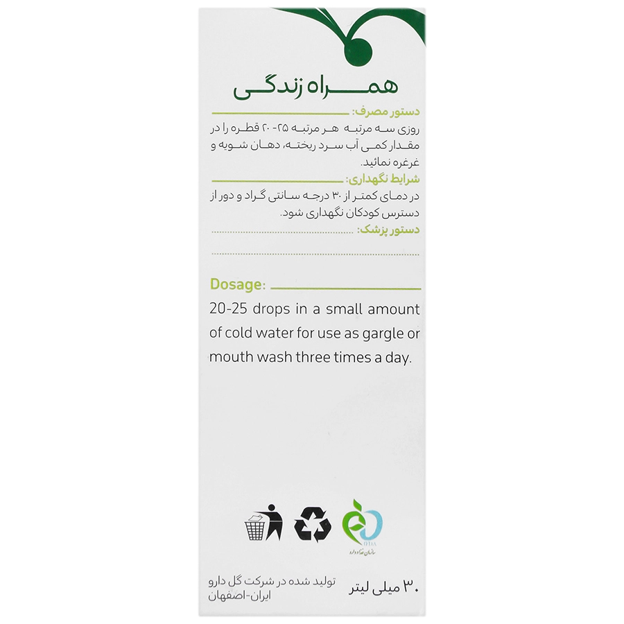 روزی سه مرتبه هر مرتبه 20-25 قطره را در نصف لیوان آب سرد ریخته، دهان شویه و غرغره نمایید.