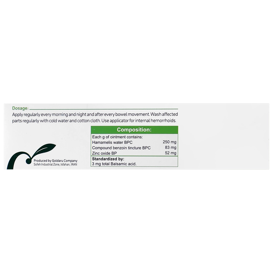حاوی 250 میلی گرم آب هاماملیس، 83 میلی گرم تنطور بنژوئن و 52 میلی گرم اکسید روی در هر گرم