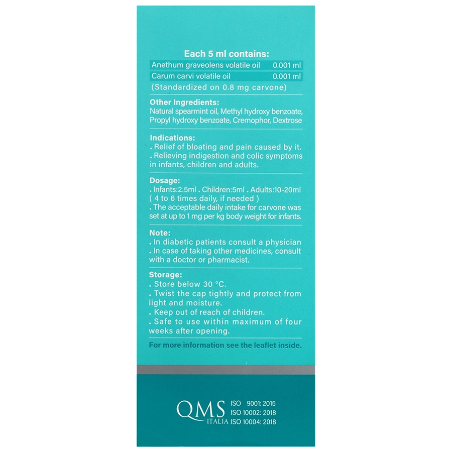 اسانس های موجود در این فرآورده با تاثیر موضعی برروی غشاء مخاطی جدار معده سریعا موجب افزایش فعالیت عصب واگ و در نتیجه افزایش شدت حرکات معده می گردد که این امر باعث خروج گازهای ناشی از نفخ و افزایش ترشحات سیستم گوارشی شده و موجب برطرف شدن نفخ و همچنین تسریع در هضم مواد غذایی و جلوگیری از تخمیر غذا و ایجاد گاز می گردد.
