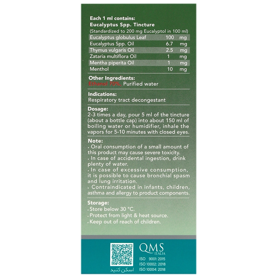 روزانه 2 الی 3 مرتبه، هربار 5 میلی لیتر (حدود یک درب بطری) از محلول را در حدود 150 میلی لیتر آب جوش یا دستگاه بخور ریخته، 5 تا 10 دقیقه با چشمان بسته بخارات حاصله را استنشاق نمایید.