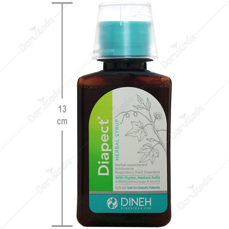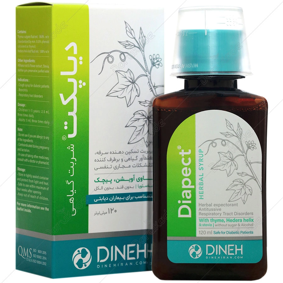 شربت دیاپکت به دلیل وجود آویشن و عشقه که اثرات آنها در درمان سرفه و برونشیت مورد تایید است، دارای خواص ضد التهاب و اسپاسم برونش ها می باشد. به علاوه خاصیت ضد باکتریایی، ضد قارچی و ضد ویروسی مواد موثره آویشن و عشقه ثابت شده است. تیمول (ماده موثره اصلی آویشن) با دفع از طریق مجاری تنفسی فوقانی، باعث ضدعفونی این مجاری می شود. سایر ترکیبات موجود در عصاره از جمله فلاونوییدها با اثرات ضدالتهابی موجب رفع تحریکات و التهابات مجاری تنفسی می گردد. در فرمولاسیون این که شربت همچنین از گیاه ختمی استفاده شده است. موسیلاژ تولید شده توسط ختمی به عنوان یک لایه محافظ بر مخاط آسیب دیده گلو عمل کرده و دارای خواص نرم کنندگی،ضد سرفه و ضد التهاب می باشد. این فرآورده فاقد الکل و شکر بوده و به عنوان شربت سینه برای کلیه افراد دارای رژیم های فاقد قند از قبیل بیماران دیابتیک قابل استفاده می باشد. در این شربت به جای شکر از شیرین کننده طبیعی استویا استفاده شده است. این شربت در اطفال نیز قابل استفاده می باشد.