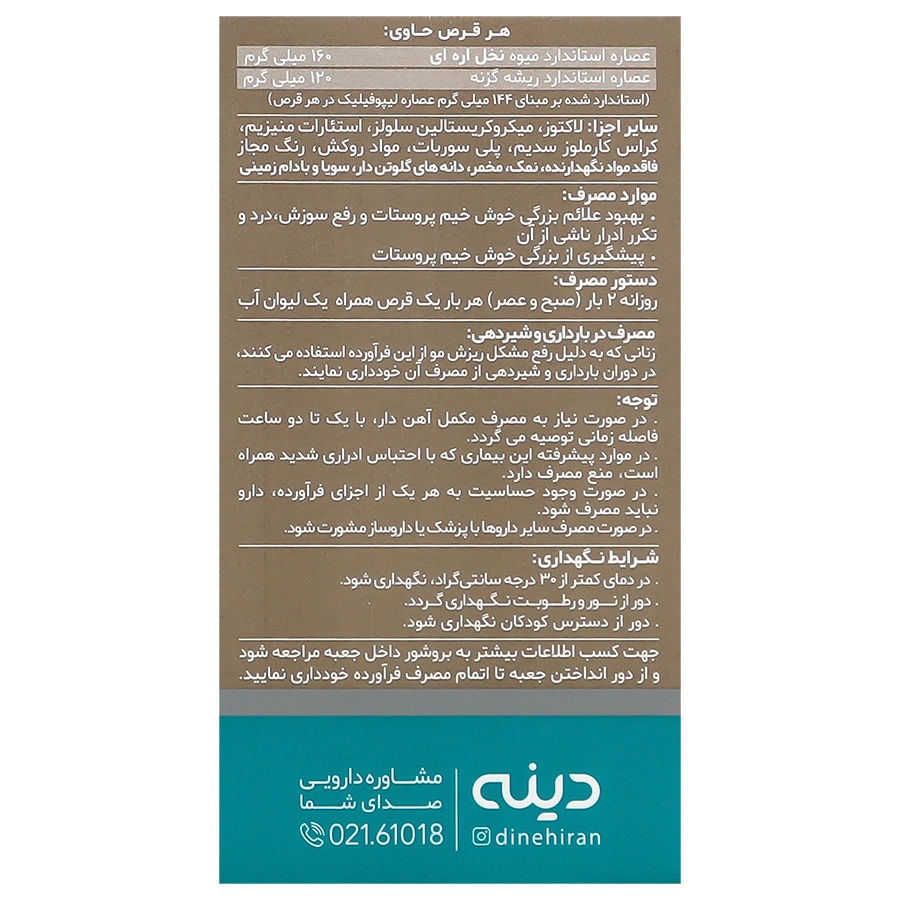 استاندارد شده بر مبنای 144 میلی گرم عصاره لیپوفیلیک در هر قرص