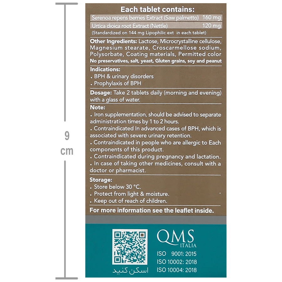 دستور منع مصرف: - در بیماران مبتلا به بزرگی خوشخیم پروستات پیشرفته با احتباس ادراری شدید، منع مصرف دارد. - در صورت وجود حساسیت به ریشه گزنه و میوه نخل ارهای، دارو نباید مصرف شود.