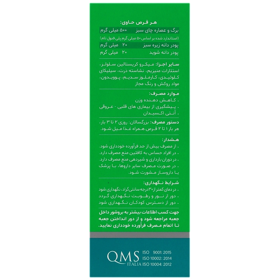 عوارض جانبی: در دوز معمولی عارضه جانبی خاصی مشاهده نمی گردد اما مصرف زیادتر از حد مجاز، ممکن است باعث بی قراری، تحریک پذیری، بیخوابی، سردرد، سرگیجه و تپش قلب گردد. در افراد حساس، عوارض گوارشی مانند افزایش اسید معده، تحریک معده، کاهش اشتها، اسهال یا یبوست با مصرف چای سبز گزارش شده است. جهت رفع عوارض گوارشی به فرمول فرآورده، زیره سبز و شوید اضافه شده است. مصرف شیر نیز همراه با این قرص جهت کاهش عوارض موثر است . در صورت حساسیت به مصرف چای در به خواب رفتن، از مصرف آن به هنگام شب خودداری گردد.