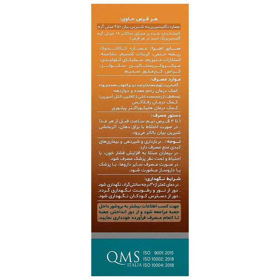 هر قرص حاوی عصاره دگلیسیریزینه شیرین بیان 450 میلی گرم