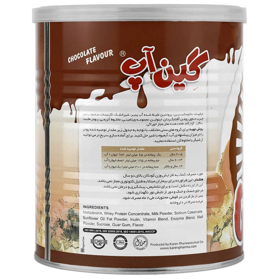 نکات: در صورت حساسیت به هر یک از اجزای این محصول از مصرف آن خودداری نموده و با پزشک مشورت نمایید. مقادیر مصرف بر حسب وزن، جنس و طول دوره مصرف رعایت شود. در صورت استفاده از این مکمل مقدار بیشتری آب در طول روز بنوشید تا مواد زاید حاصل از متابولیسم پروتئین ها از بدن دفع شود. به این منظور باید به ازای مصرف هر پیمانه از گین آپ یک لیوان آب به مصرف روزانه اضافه کنید. مصرف این فرآورده در افرادی که داروهای آنتی پیرین وتئوفیلین استفاده می کنند، مجاز نمی باشد. این محصول حاوی فنیل آلانین می باشد؛ بنابراین در بیماران مبتلا به فنیل کتونوری نباید مصرف شود. در افراد مبتلا به نارسائی کلیوی این مکمل ها مصرف نشود.