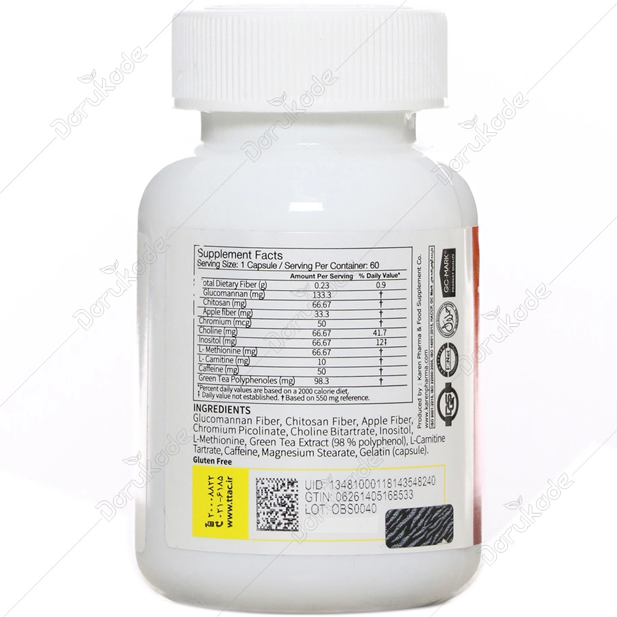 مواد تشکیل دهنده: فیبرهای محلول (فیبر پسیلیوم، فیبر گلوکومانان، فیبر چیتوزان و فیبر سیب) پیکولینات کروم و بی تارتارات کولین اینوزیتول و ال- متیونین عصاره چای سبز ال- کارنیتین کافئین