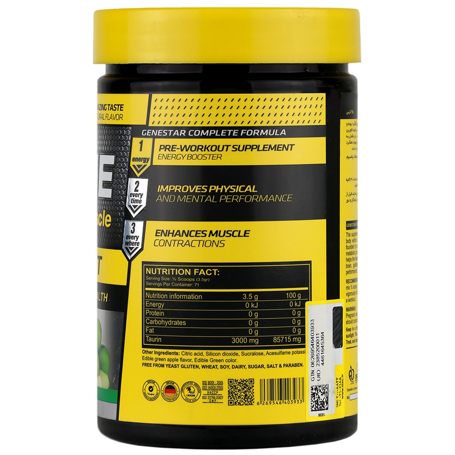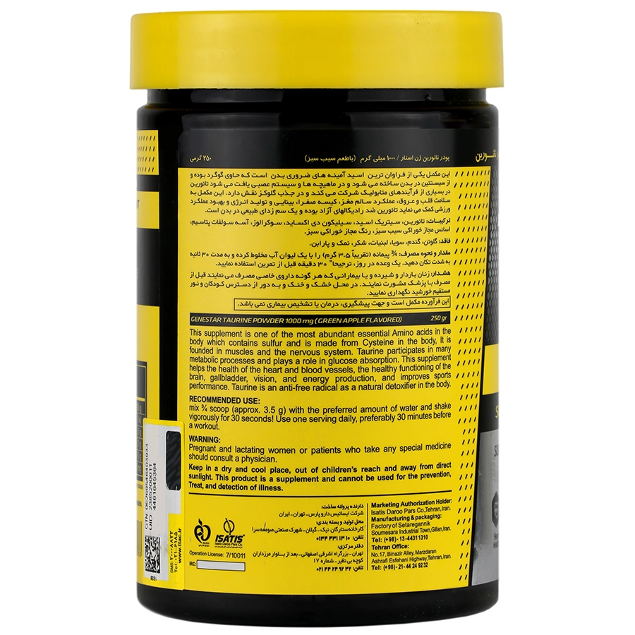 این مکمل یکی از فراوان ترین اسید آمینه های ضروری بدن است که حاوی گوگرد بوده و از سیستئین در بدن ساخته می شود و در ماهیچه ها و سیستم عصبی یافت می شود. تائورین در بسیاری از فعالیت های متابولیک شرکت می کند و در جذب گلوکز نقش دارد. این مکمل به سلامت قلب و عروق، عملکرد سالم مغز، کیسه صفرا بینایی و تولید انرژی و بهبود عملکرد ورزشی کمک می نماید. تائورین ضد رادیکال های آزاد بوده و یک سم زدای طبیعی در بدن است.