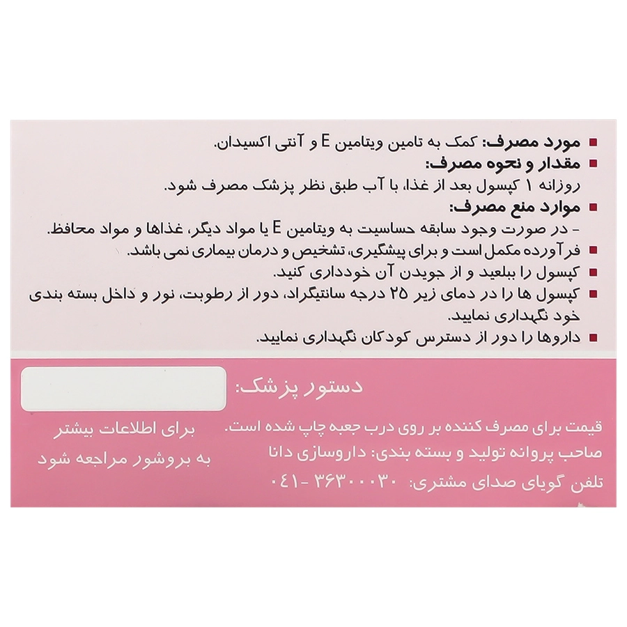 موارد منع مصرف: - در صورت وجود حساسیت به ویتامین E و سایر اجزای آن، غذاها و مواد محافظ.