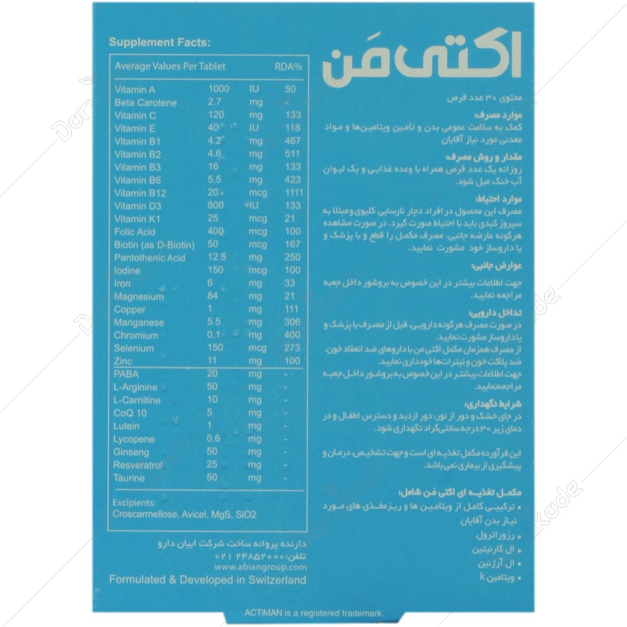 تداخل دارویی: در صورت مصرف هرگونه دارویی، قبل از مصرف با پزشک و یا داروساز مشورت نمایید. از مصرف همزمان مکمل اکتی من با داروهای ضد انعقاد خون (مانند وارفارین)، ضد پلاکت خون (مانند آسپرین) و نیترات ها (مانند نیتروگلیسیرین) خودداری نمایید.