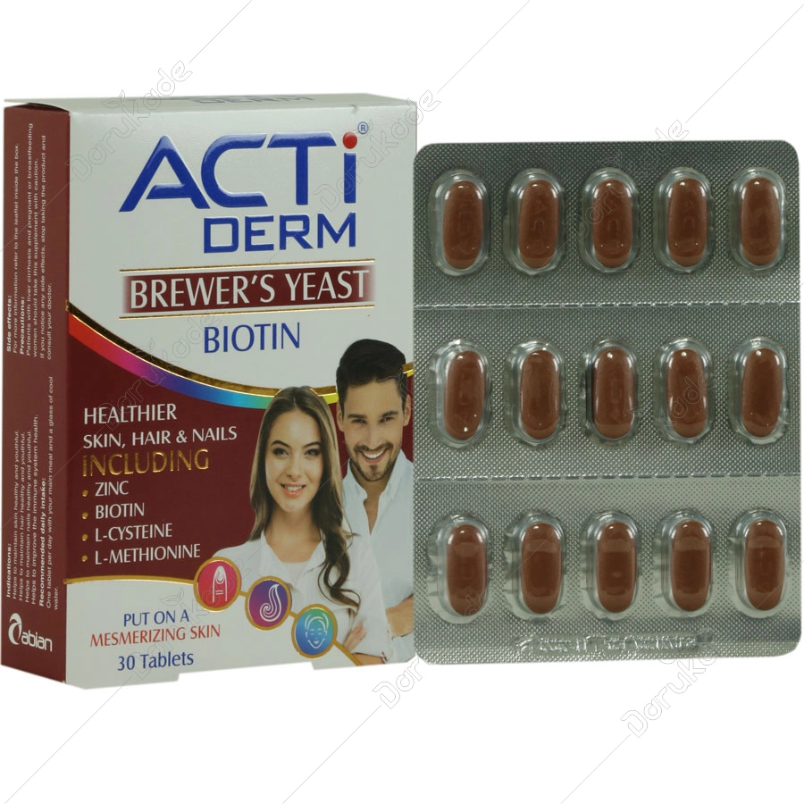 فرمولاسیون این محصول شامل ترکیبی از مخمر آبجو، زینک، بیوتین، اسید آمینه های ال سیستئین و ال متیونین است. اکتی درم سبب جوانسازی پوست، سلامت مو و تقویت ناخن ها می شود. مکمل اکتی درم باعث جلوگیری از ریزش مو، بهبود بافت و افزایش ضخامت مو شده و همچنین سبب بهبود رنگ و درخشندگی مو، پوست و ناخن ها نیز می گردد. ترکیبات موجود در این محصول به صورت مستقیم و یا غیر مستقیم نقش خود را در سلامت پوست، مو و ناخن ها ایفا کرده و علاوه بر این می توانند اثر یکدیگر را تقویت کنند.