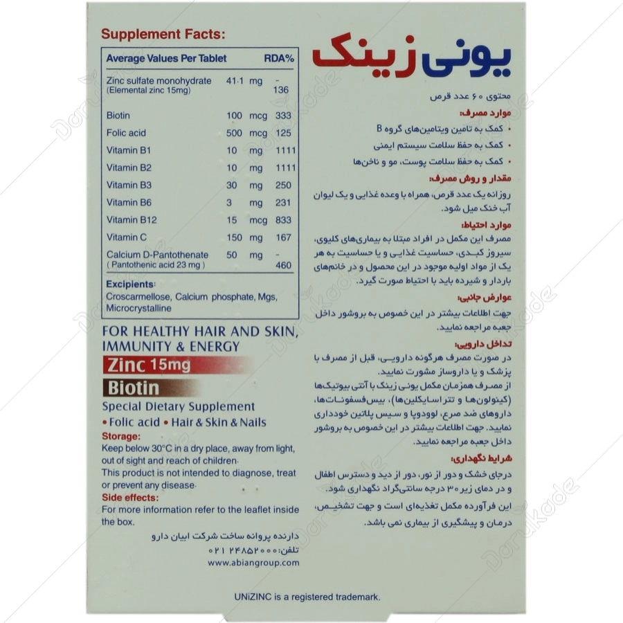 فرمولاسیون Uni zinc شامل ترکیبی از روی (زینک)، ویتامین های گروه B و ویتامین C می باشد. قرص Uni Zinc موجب حفظ سلامت پوست، مو، ناخن ها و تقویت سیستم ایمنی بدن می گردد.