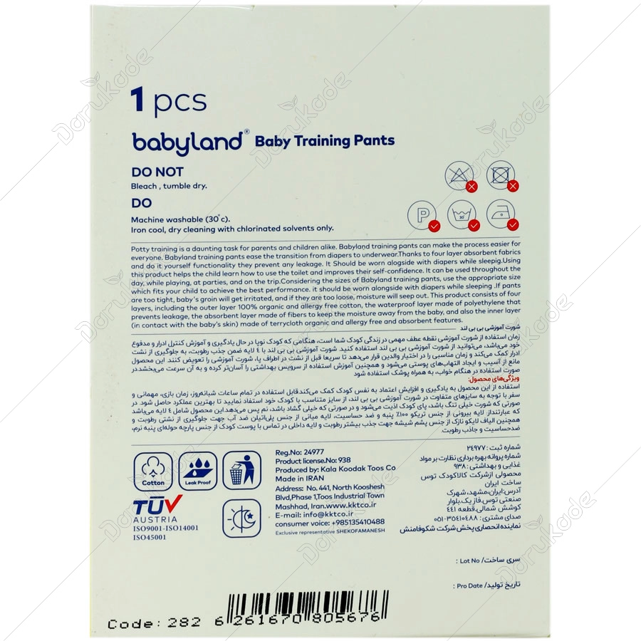 زمان استفاده از شورت آموزشی نقطه عطف مهمی در زندگی کودک شما است، هنگامی که کودک نوپا در حال یادگیری و آموزش کنترل ادرار و مدفوع خود می باشد، می توانید از شورت آموزشی بی بی لند استفاده کنید. شورت آموزشی بی بی لند با 4 لایه ضمن جذب رطوبت، به جلوگیری از نشت ادرار کمک میکند و زمان مناسبی را در اختیار والدین قرارمی دهد تا سریعا قبل از نشت در اطراف پا، شورت آموزشی را تعویض کنند. این محصول مانع از آسیب و ایجاد التهاب های پوستی می شود و همچنین آموزش استفاده از سرویس بهداشتی را آسان تر کرده و به آن سرعت می بخشد. درصورت استفاده در هنگام خواب، به همراه پوشک استفاده شود.