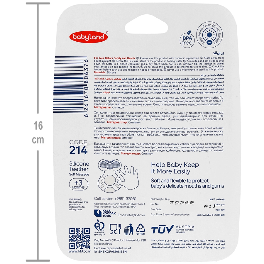 لثه نوزاد در طول دوره رویش دندان بسیار ملتهب است و این امر باعث ایجاد ناراحتی و بی قراری وی می گردد. دندان گیر سیلیکونی مامالند با سطحی نرم و منعطف بدون آسیب به لثه نوزاد، بهترین وسیله برای ماساژ لثه و آرام کردن بی قراری های کودک است. همچنین اشکال هندسی و پرزهای سیلیکونی سطح و کناره های این محصول، به پاکسازی لثه ها و دندان های تازه روییده نوزاد کمک کرده و همزمان لثه وی را ماساژ می دهد. طراحی این دندانگیر کاملا ارگونومیک می باشد و به راحتی در دستان کوچک کودک جای می گیرد.