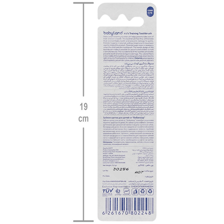 مسواک یادگیری بی بی لند به والدین کمک می کند تا از سلامت کودکان خود مراقبت نمایند. این مسواک دارای موهای ظریف و نرمی می باشد دندان های شیری محافظت می کند و به علت آسیب نمی رساند. برای تولید این محصول از مواد کاملا بهداشتی و فاقد بیس فنل A استفاده شده است.
