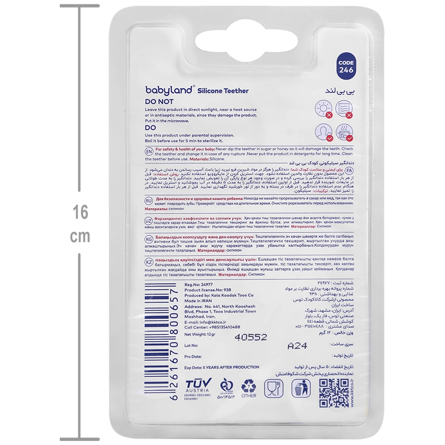 دندانگیر سیلیکونی شفاف بیبیلند با طراحی مطابق با زوایای صورت کودک و فرم طبیعی کام و لثه، ضمن تنظیم فشار روی دندان های کودک، لثه را به آرامی ماساژ میدهد و در نتیجه منجر به تکمیل فرآیند رشد دندان ها میشود. دسته های دندانگیر به طور دقیق لثه را ماساژ میدهند و درد ناشی از رویش دندان را کاهش میدهند. همچنین حفره میانی به کودک کمک میکند تا دندان خود را راحت تر نگه دارد.