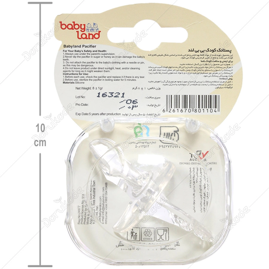 پستانک ارتودنسی بیبی لند کد 274 تهیه شده از مواد کاملا بهداشتی و طراحی شده بر اساس شکل طبیعی کام و لثه کودک است و مانع از تغییر فرم بینی کودک میشود. این پستانک از جنس سیلیکون خالص و بی ضرر برای سلامت کودک است.
