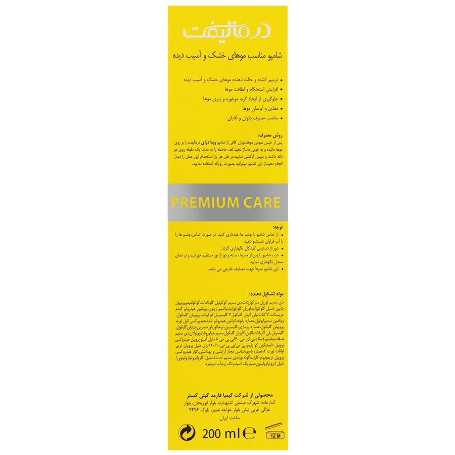 شامپو ویتا درای با عصاره گیاه بامبو و بابونه باعث تقویت و تغذیه عمیق مو ها شده و با ترکیبات کراتین خود وز، خشکی و شکنندگی مو را از بین می برد. همچنین سدیم هیالورونات موجود در این شامپو رطوبت مناسب ساقه های مو را تامین نمود و PH پوست سر را تنظیم می کند.