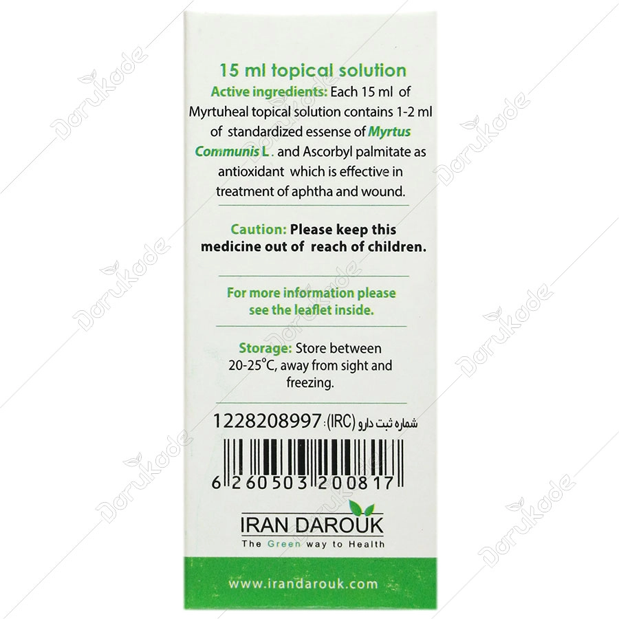 هر 15 میلی لیتر محلول موضعی میرتوهیل از 2-1 میلی لیتر اسانس گیاه مورد و نیز آسکوربیل پالمیتات استاندارد شده است.