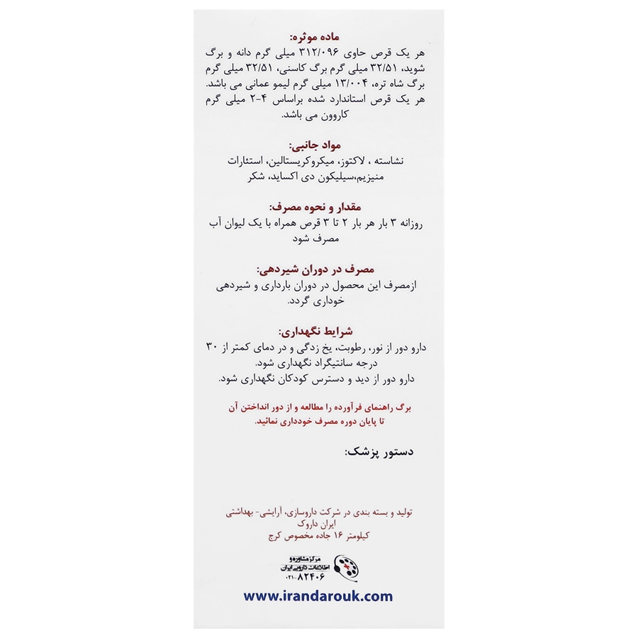 هر قرص حاوی 312.096 میلی گرم دانه و برگ شوید، 32.51 میلی گرم برگ کاسنی، 32.51 میلی گرم برگ شاه تره، 13.004 میلی گرم لیمو عمانی