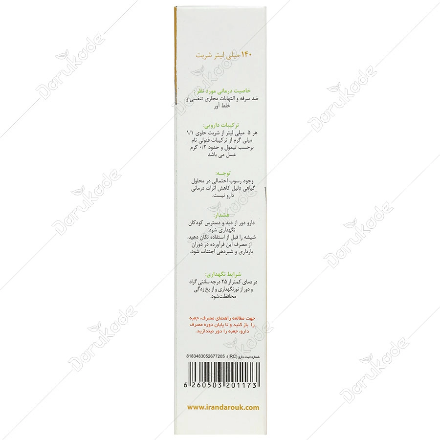 وجود رسوب احتمالی در محلول گیاهی دلیل کاهش اثرات درمانی دارو نیست. از مصرف این فرآورده در دوران بارداری و شیردهی اجتناب شود.