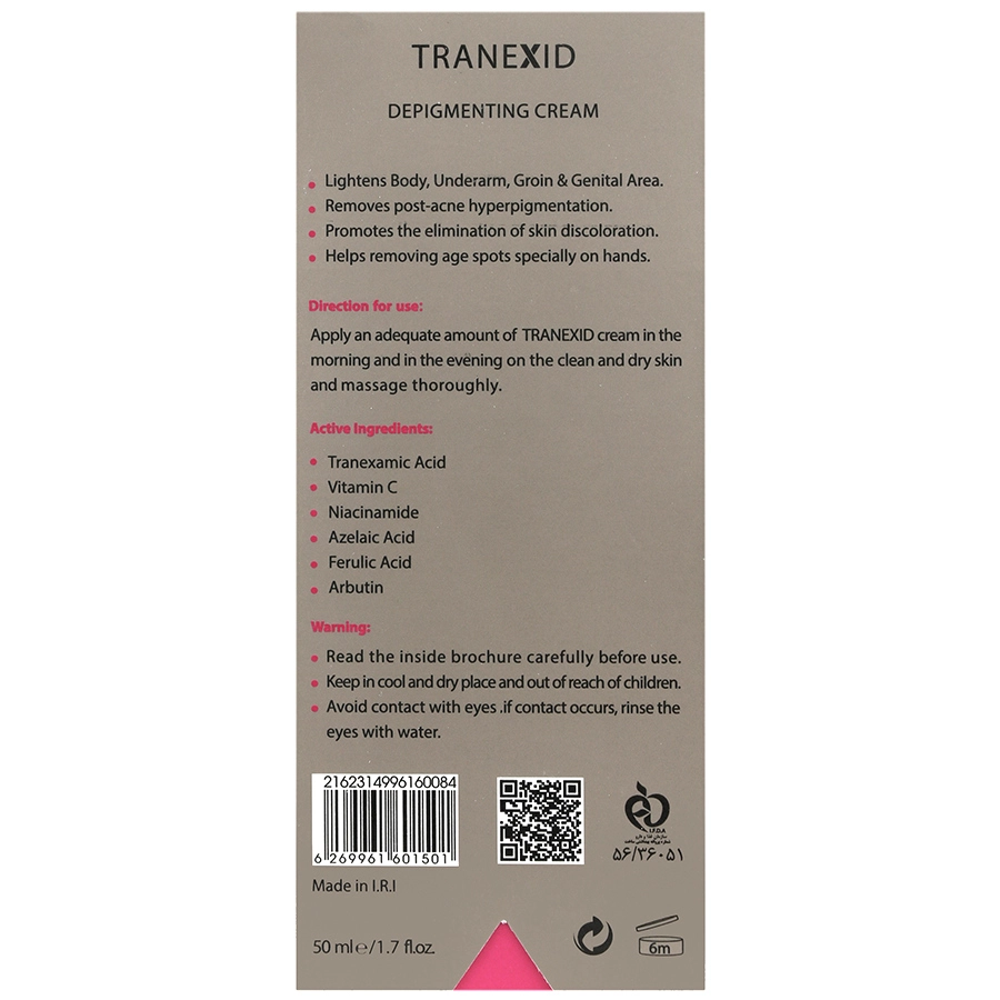کرم ترنکسید شرکت کیمیا فارمد گیتی گستر با مجموعه کامل از انواع مواد روشن کننده باعث کاهش تیرگی های پوست بدن، پشت دست ها، زیر بغل، کشاله ران و ناحیه تناسلی می شود و به از بین بردن لک های قوی کمک و از تجمع رنگدانه ها به روی پوست جلوگیری نموده و روشنی و شفافیت پوست را در پیش دارد.