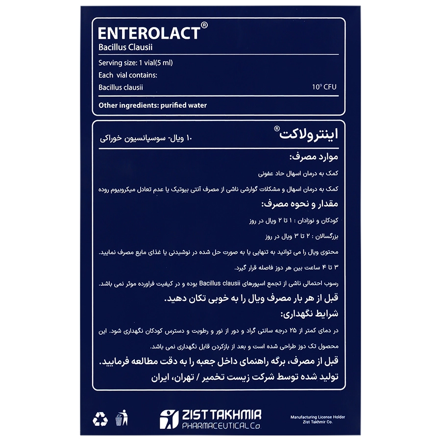 اينترولاكت سوسپانسيونى از اسپور باسيلوس كلوزى مى باشد كه سبب بهبود ميكروبيوم روده مى كردد و در مقابل اسيد معده مقاوم است و به خوبى مى تواند از آن عبور كرده و به محل اثر خود در روده برسد. اينترولاكت مى تواند عامل بهبود ميكروبيوم روده گردد و همچنين توانايى سنتز ويتامين هاى گروه B را داراست. اين محصول براى كودكان و حتى نوزادان هم قابل استفاده مى شود.