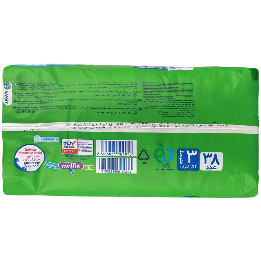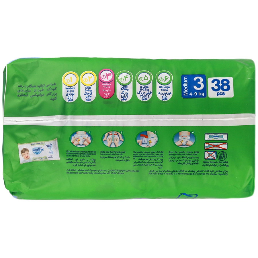 1- پوشک را طوری زیر کودکتان بگذارید تا طرح های جذاب مولفیکس سمت جلوی کودک قرار گیرد 2- دقت کنید تا لایههای محافظ عمودی به سمت داخل تا شده باشد 3- پودر کرم یا روغن بچه هیچگونه اثری روی چسبهای بغل انعطافپذیر مولفیکس که بارها قابل استفادهاند نمیگذارد 4- چسبهای بغل انعطافپذیر مولفیکس را طوری بچسبانید که در هر دو طرف فاصله یکسان باقی بماند