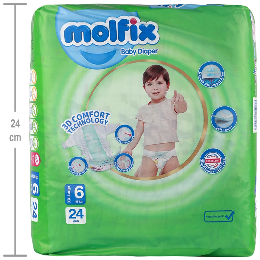 پوشک را زیر بچه بگذارید تا طرح های جذاب آن به سمت جلو باشد. مطمئن شوید که لایههای محافظ عمودی به سمت داخل تا خورده باشند. پودر کرم یا روغن بچه هیچگونه اثری روی چسبهای بغل انعطافپذیر مولفیکس که بارها قابل استفادهاند نمیگذارد. چسبهای بغل انعطافپذیر مولفیکس را طوری بچسبانید که در هر دو طرف فاصله یکسان باقی بماند.