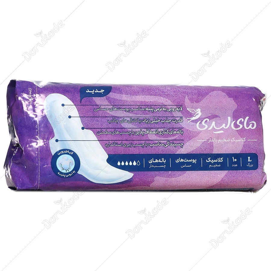 ترکیبات این نوار بهداشتی عبارتند از: لایه پلی اتیلن- پلی پروپلین- سلولز- پودرجاذب- نوارسیلیکون-چسب حرارتی و با قدرت جذب 3 قطره می باشد. نوار بهداشتی مای لیدی با بررسی حساسیت های ناشی از استفاده مداوم از نوار بهداشتی، محصولی کاملا راحت و ضد حساسیت طراحی کرده که در زمان استفاده از آن دچار حساسیت نشوید.