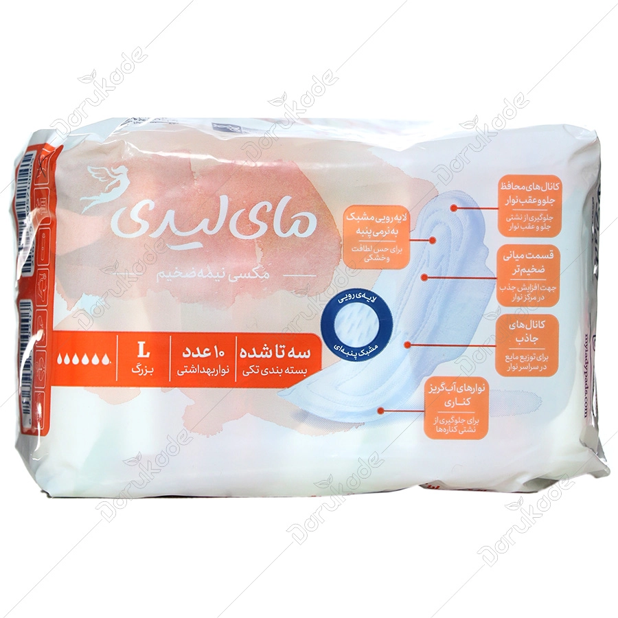 نوار بهداشتی بالدار بزرگ مای لیدی، دارای لایه رویی مشبک به نرمی پنبه برای حس لطافت و خشکی می باشد. این پد نیمه ضخیم بوده و حاوی پودر جاذب با قدرت جذب خیلی خیلی زیاد می باشد.