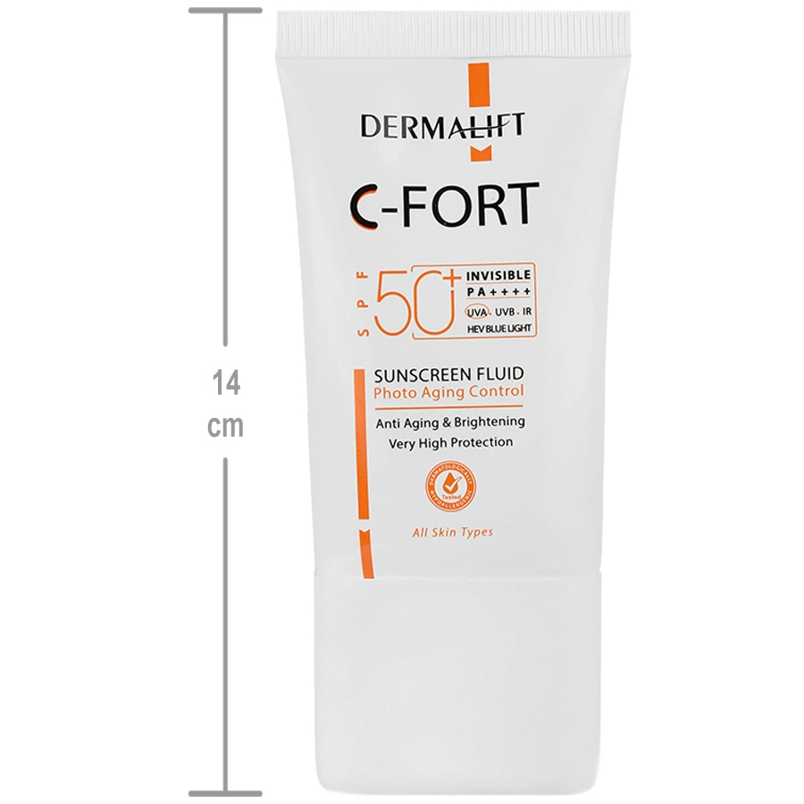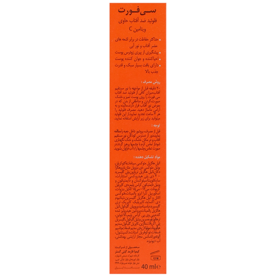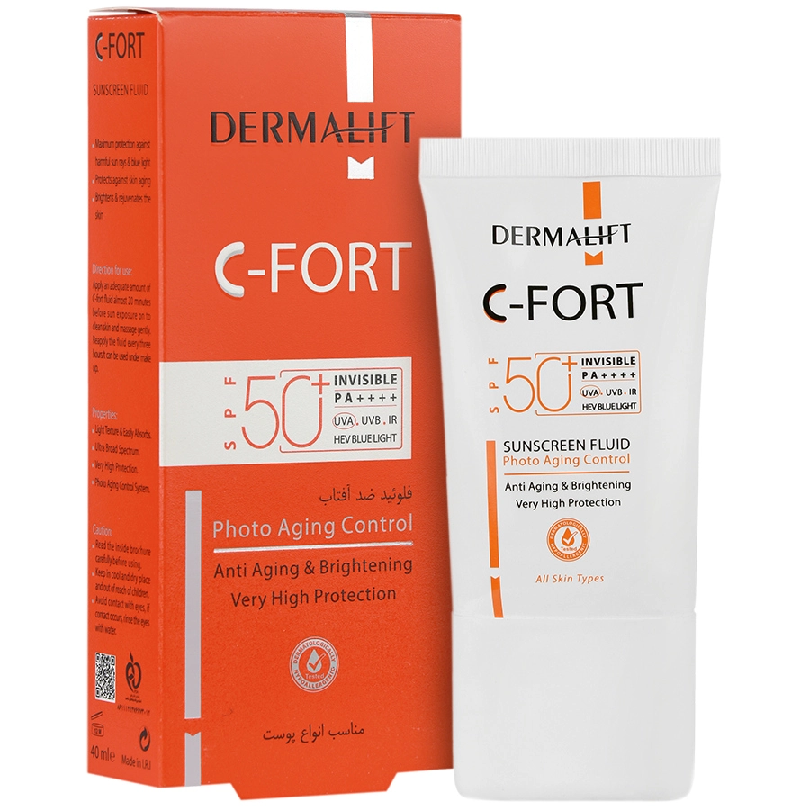 شرکت کیمیا فارمد گیتی گستر تولید کننده فرآورده های تخصصی مراقبت از پوست و مو درمالیفت، پس از سال ها تحقیق و کسب تجربه در زمینه فرمولاسیون های پیشرفته و با همکاری کمپانی های بزرگ بین المللی موفق به تولید فلوئید ضد آفتاب سی فورت حاوی ویتامین سی لیپوزومال گردیده است. فلوئید برخلاف کرم بافت سبکی دارد و همانطور که از نامش پیداست، مانند مایع روان بوده و غلظت پایینی دارد. جذب این محصول بسیار سریع بوده و چربی اضافی روی پوست ایجاد نمی نماید. این محصول مناسب انواع پوست بوده و بعلت میزان کم چربی، بهترین انتخاب برای پوست های چرب و جوشدار می باشد. فلوئید سی فورت حاوی ویتامین سی و قویترین کمپلکس روشن کننده و ضد پیری پوست بوده و بهترین گزینه برای افرادیست که بدنبال یک ضد آفتاب مناسب با خواص روشن کنندگی و ضد پیری پوست می باشند. این ضد آفتاب محدودیت سنی ندارد و مصرف همزمان آن با کرم ویتامین سی درمالیفت نتایج فوق العاده ای به دنبال دارد.