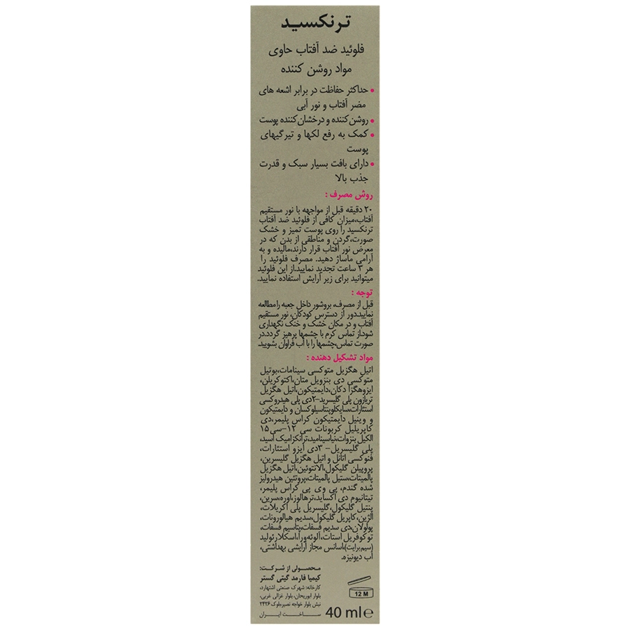 شرکت کیمیا فارمد گیتی گستر تولید کننده فرآورده های تخصصی مراقبت از پوست و مو درمالیفت، پس از سال ها تحقیق و کسب تجربه در زمینه فرمولاسیون های پیشرفته و با همکاری و کمپانی های بزرگ بین المللی موفق به تولید فلوئید ضد آفتاب روشن کننده ترنکسید گردیده است.