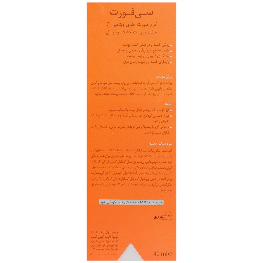 شرکت کیمیا فارمد گیتی گستر پس از سال ها تحقیق و کسب تجربه در زمینه فرمولاسیون های پیشرفته و با همکاری دو کمپانی اروپایی اکسپنساینس و سولاییا موفق به تولید کرم حاوی ویتامین سی گردیده است در کرم سی فورت در مالیفت علاوه بر ویتامین سی از یک کمپلکس قوی ضدپیری و روشن کننده استفاده گردیده است. این کرم مناسب پوست های خشک و معمولی بوده و کمک شایانی به افزایش آبرسانی به پوست و رفع خشکی و زبری پوست می نماید.
