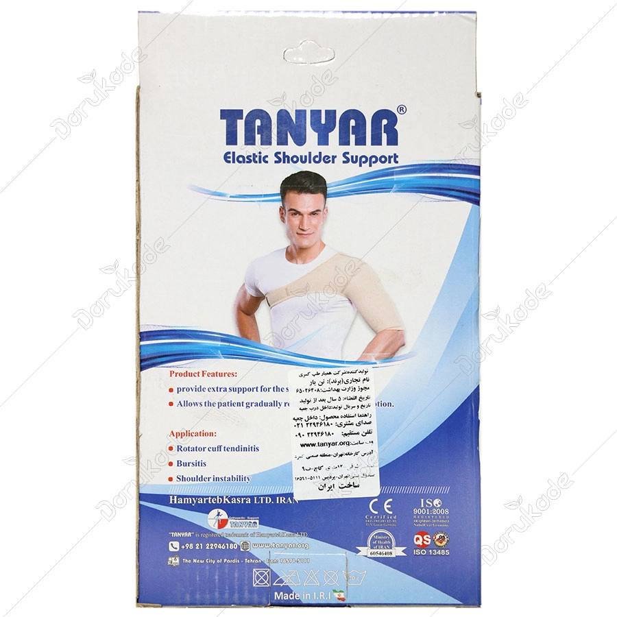 دست را درون آستین ساپورت قرار دهید. آستین را از بازو به طرف شانه بالا بکشید. استرپ جلویی را از عرض سینه و استرپ پشتی را از عرض پشت عبور دهید. دو استرپ را زیر بغل بازوی مخالف روی هم ببندید. مطمئن شوید که ساپورت بر روی شانه کاملا فیت شده باشد. - مدت استفاده از محصول: در صورتی که با تجویز پزشک ارتوپد از این ارتز استفاده مینمایید، با توجه به نظر ایشان عمل نمایید. در غیر این صورت از این محصول به مدت 8 هفته معادل 2 ماه استفاده نمایید.