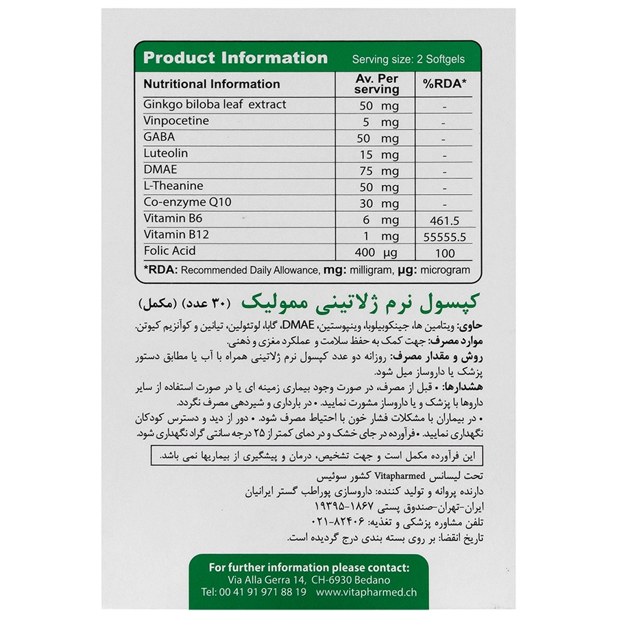 حاوی ویتامین ها،جینکوبیلوبا،وینپوستین، DMAE، گابا، لوتئولین، تیانیتن و کوآنزیم کیوتن