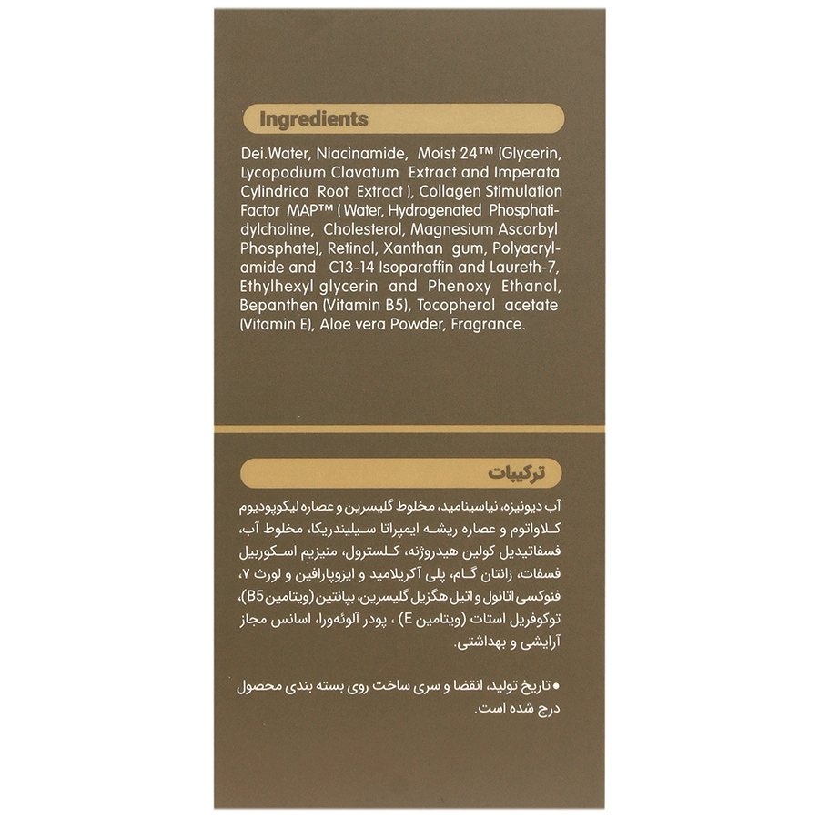 تركيب اصلى اين سرم، رتينول است. رتينول يكى از تركيبات قوى ضد پيرى و يكى از مشتقات ويتامين A می باشد. اين ماده باعث افزايش سوخت و ساز و توليد سلول هاى جديد پوستى می شود و همين مسئله سطح كلاژن موجود در پوست را افزايش می دهد كه در نتيجه باعث كاهش چين و چروک هاى پوست می شود.