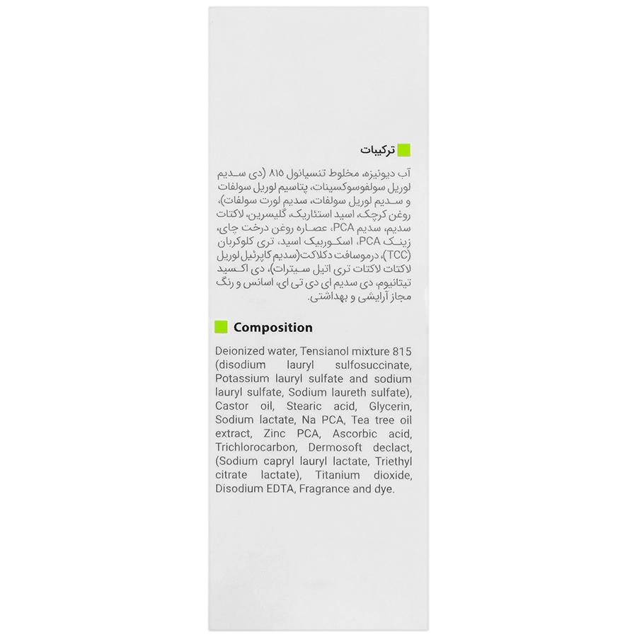 حاوی روغن درخت چای، زینک PCA تری کلوکربال، درماسافت دکلاکت و ویتامین C