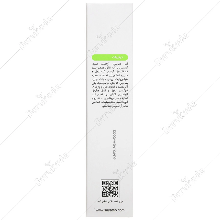 حاوی آزلائیک اسید، نیاسینامید، سالسیلیک اسید، گلیسیرین، روغن درخت چای، ویتامین B5، پودر آلوئه ورا