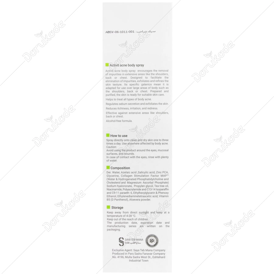 روزانه یک تا سه بار محلول را روی پوست تمیز و خشک اسپری نمایید. پس از مصرف به شستشو نیازی نیست.