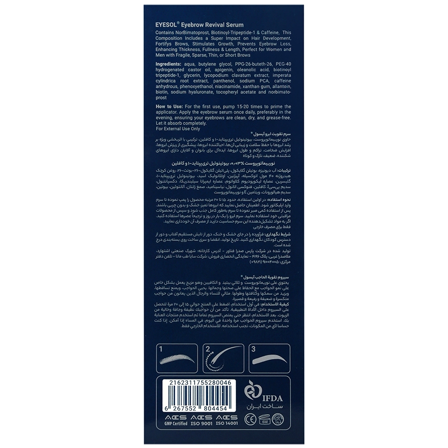 سرم تقویت ابرو آیسول یک محصول بسیار موثر برای دستیابی به ابروهای ضخیم تر و پر پشت تر می باشد. این سرم با تغذیه عمیق ابروها، در مدت زمان 6 تا 8 هفته به طور چشم گیری تیرگی و حجم ابروها را افزایش داده و نواحی خالی ابرو را به شکل طبیعی و یکنواخت پر می کند.