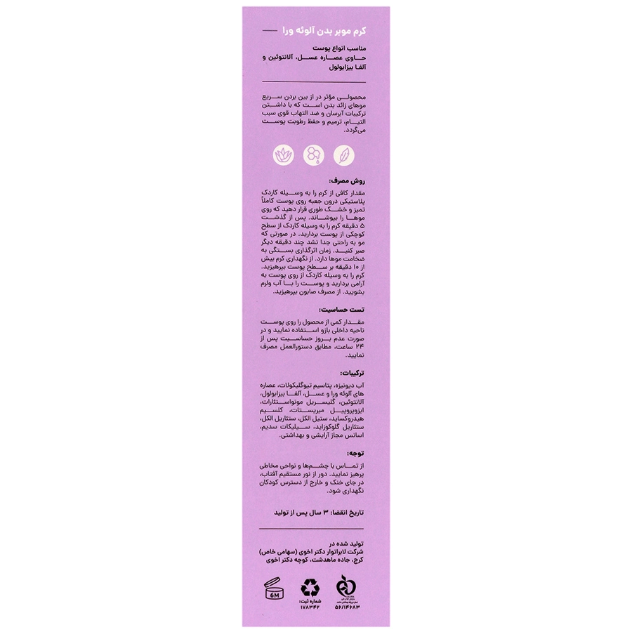 زمان اثرگذاری بستگی به ضخامت موها دارد. از نگهداری کرم بیش از 10 دقیقه بر سطح پوست بپرهیزید. کرم را به وسیله کاردک از روی پوست به آرامی بردارید و پوست را با آب ولرم بشویید. از مصرف صابون بپرهیزید.