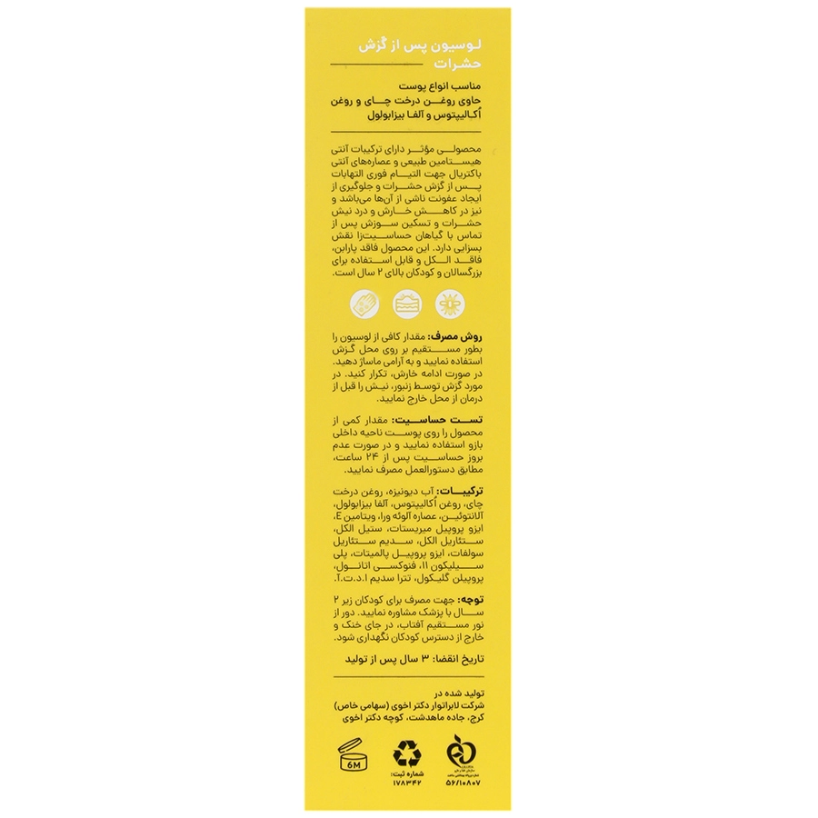 مقدار کافی از لوسیون به طور مستقیم بر روی محل گزش استفاده نمایید و به آرامی ماساژ دهید. در صورت ادامه خارش، تکرار کنید. در مورد گزش توسط زنبور، نیش را قبل از درمان از محل خارج نمایید.