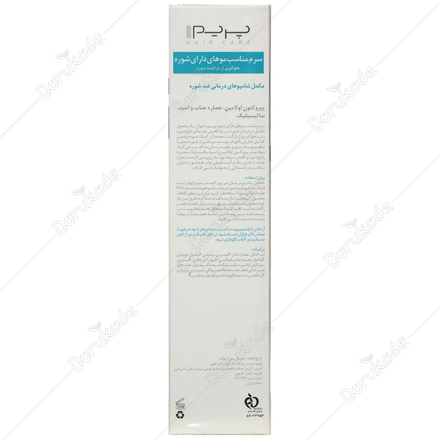 سرم مناسب موهای دارای شوره پریم به عنوان یک محصول مکمل در درمان شوره سر، به کاهش چشمگیر انواع شوره سر و جلوگیری از بازگشت مجدد آن کمک نموده و ضمن کنترل خارش و التهاب پوست سر ناشی از شوره منجر به تنظیم پوسته ریزی و رطوبت رسانی به کف سر می گردد. مواد موثر پیروکتون اولامین و اسید سالیسیلیک منجر به رفع شوره و کاهش سرعت پوسته ریزی می گردند و عصاره عناب در نقش یک ترکیب طبیعی موثر علیه شوره و خارش سلامت و درخشندگی را به موها باز می گرداند.
