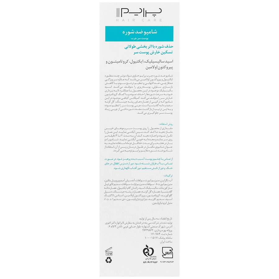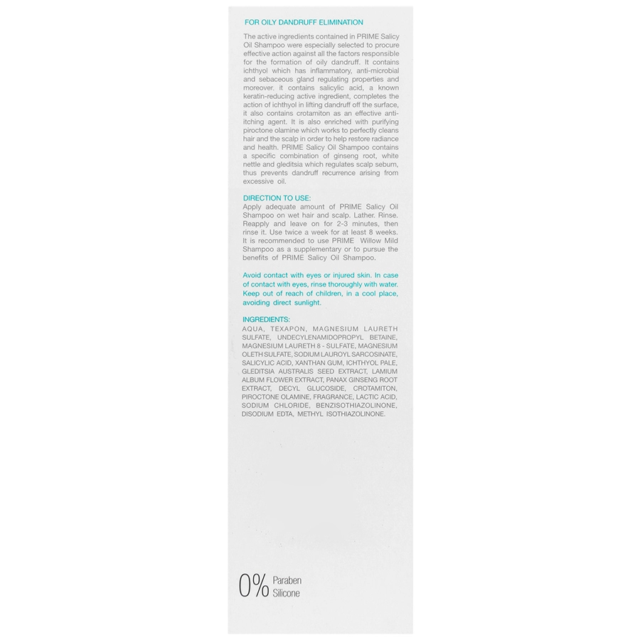 شامپو ضد شوره چرب پرایم حاوی مواد موثر چند منظوره ایکتیول و پیریکتون اولامین می باشد که علاوه بر ویژگی ضد قارچی، ضد التهابی و تنظیم ترشح سبوم، با کاهش بازسازی سلولی، پوسته ریزی را متوقف می کند. اسید سالیسیلیک موجود در این محصول با عملکرد لایه برداری خود به سرعت شوره ها را حذف نموده و با کمک کروتامیتون خارش سر را متوقف می کند. کمپلکس گیاهی موجود در این شامپو که ترکیی از عصاره های ریشه جینسنگ، گل گزنه سفید و دانه گلدیتسیا است، چربی پوست سر را تنظیم نموده و به این ترتیب از بازگشت مجدد شوره ناشی از چربی زیاد پوست سر جلوگیری می کند.