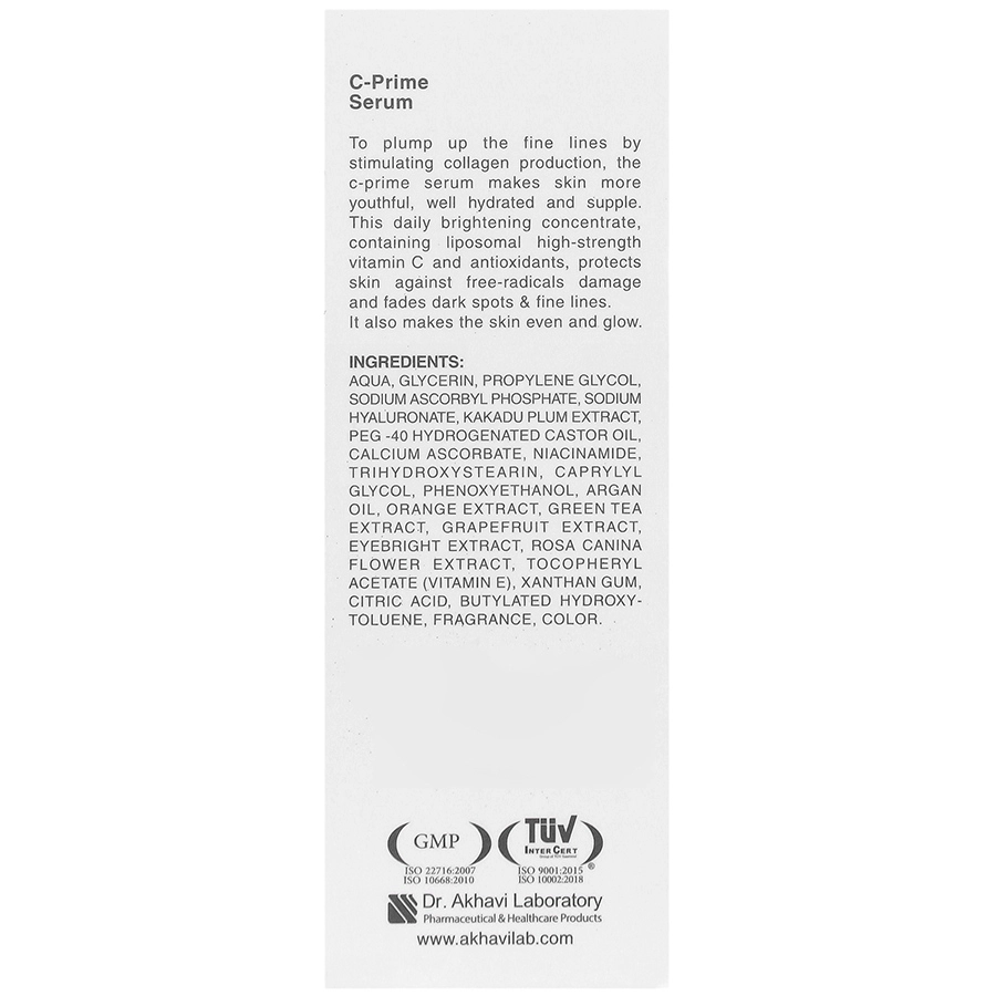 با مصرف این محصول روزبهروز به شفافیت، شادابی و صافی پوست افزوده خواهد شد. کلاژن موجب قوام و سلامتی پوست میشود، با افزایش سن ساخت کلاژن کاهش مییابد. ویتامین C میتواند موجب تحریک کلاژن سازی شود و افزایش کلاژن سازی علائم پیری همچون چروکهای پوست را از بین میبرد. ویتامین C میتواند علائم آسیب پوستی ناشی از آفتاب شامل اختلالات رنگ یا همان کک و مک و ملاسما و چروکها را بهبود بخشد. به علت خاصیت آنتی اکسیدانی ویتامین C است میتواند لکهای ناشی از افزایش سن و چروکها را بهبود بخشد. سرم ویتامین C پریم لکهای ناشی از افزایش سن و هایپر پیگمانتاسیون را درمان کنند. همچنین بهعنوان لایهبردار طبیعی عمل کرده و باعث روشن شدن پوست میشود.