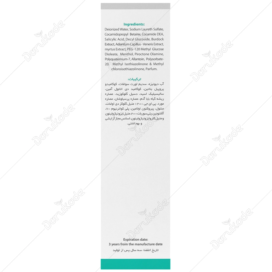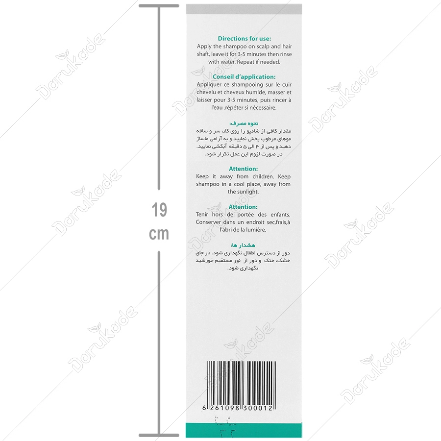 مقدار کافی از شامپو را روی کف سر و ساقه موهای مرطوب پخش نمایید و به آرامی ماساژ دهید و پس از 3 الی 5 دقیقه آبکشی نمایید. در صورت لزوم این عمل تکرار شود.