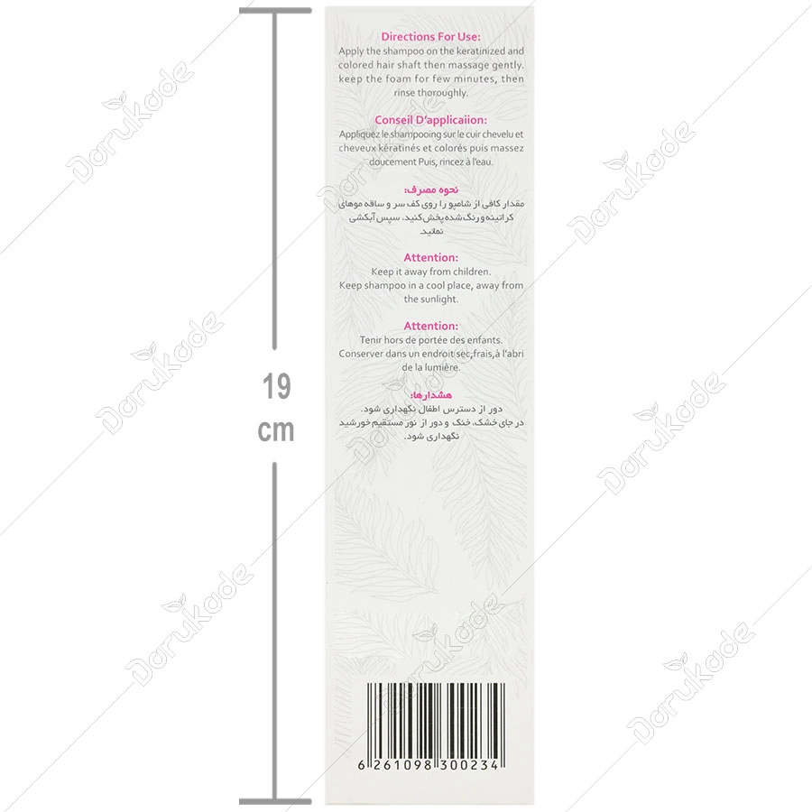 مقدار کافی از شامپو را روی کف سر و ساقه موهای کراتینه و رنگ شده مالیده و به آرامی ماساژ دهید. کف حاصله را به مدت چند دقیقه روی پوست سر نگه داشته سپس آبکشی نمائید.